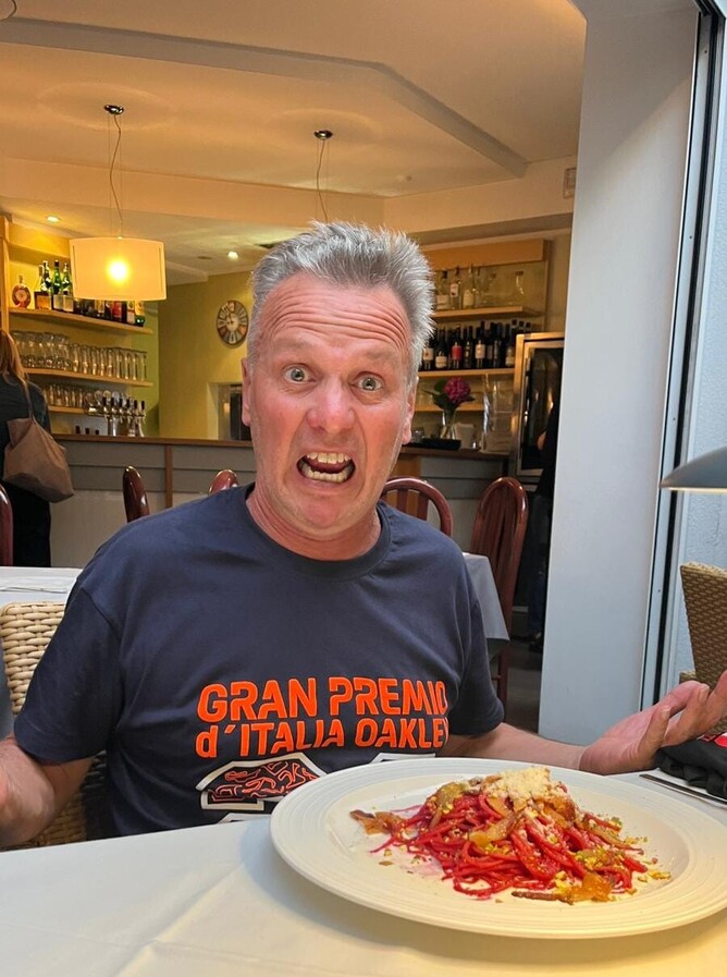MotoGP in Mugello is Ballistic! The atmosphere, The noise, 100,000+ hyped-up Fans... sensory overload in a good way. We were sitting in the Ducati stand ready to go by 0830 and then realized we had completely missed Brekkie... so half a pork leg on a bone, chips, and beer sorted that. At the GP, we ran into a few people, Andy Harworth from Nelson. He has been working in Rome and had come up for the day; being the decent chap he is, he bought Pecco a beer. Seemed to do the trick as Pecco won that afternoon with Martin a close second and Zarco third. Trace managed to catch up with Claudio Domenicali as well, and then it was time to drive back to Bologna. Getting the C3 out was the easy part; the slow grind on the backcountry roads was a three-hour crawl.