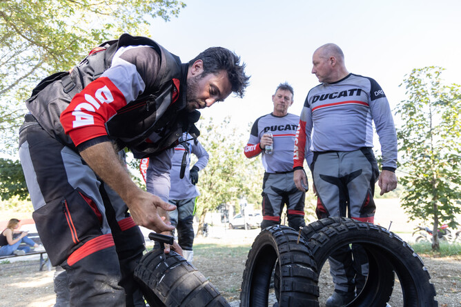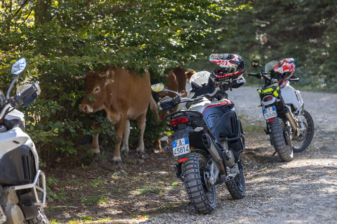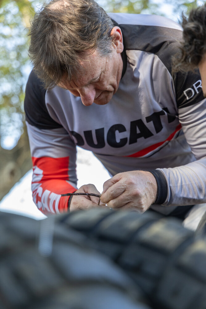 Sunday dawned another beautiful Tuscan day. We jumped on our bikes and headed for the hills as a pack of about 25 riders, plus the official photographer. Morning tea of Italian salami, cheese, sourdough bread, and water were interrupted by a herd of bell wearing cows who seemed to take exception to where weโd parked our machines. After a few tense moments and visions of a Multistrada being tossed into the woods by an angry bull, the herd moved on and we finished our refreshments. Andrea produced a tool kit, and we discussed essential items to carry on an adventure bike ride. He entertained us with a story where he and Casey Stoner helped another rider who was stuck out in the wilderness. The guy had no idea who had helped lift his bike on that day out in the wilderness until a year later when he bumped into Andrea again...