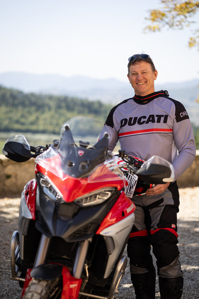 The next morning dawned a beautiful Tuscan day, with temperatures forecast to be in the low thirties. Iโve got to admit I hadnโt been this excited since being a 10-year-old on Christmas morning. Breakfast was supplied at the villa then off to the venue. I pulled into the carpark to be greeted by the impressive sight of 26 Ducati Multistrada and Desert Xโs lined up ready for action. Wow!