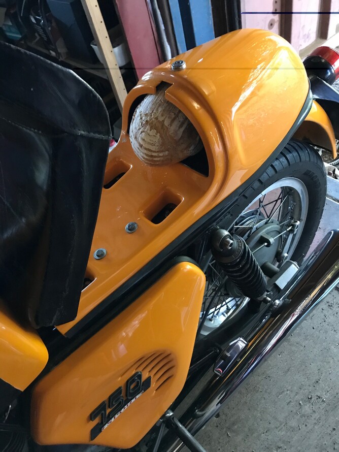 I also had to get the tank repainted after the fibreglass started to delaminate, possibly due to mistakenly filling it with bio-gas one time and partly due to a poor repair job to the tank in the past. The colour was matched to the front guard, which was, and still is, original. This way, there can be no debate about it being the right shade of yellow or orange.