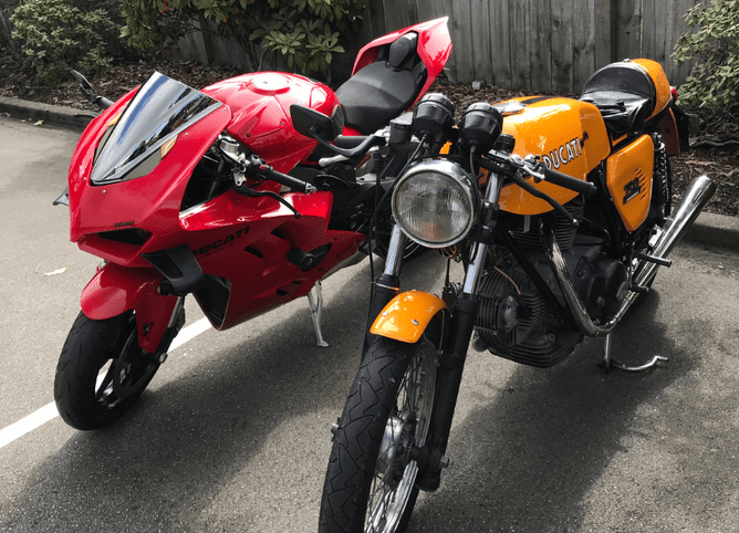 I remember the day Lionel brought the Ducati home. There it was parked in the driveway, unlike anything we had ever seen before. Bright yellow (or is it orangeโthe ongoing debate) with black engine highlights. The highest point being the rev meter and speedo sticking up above the steering head, clip-on handlebars level with the tank, rear-set foot pegs, and a single racing seat. Those now-famous straight Conti exhausts and the 90-degree V-twin.