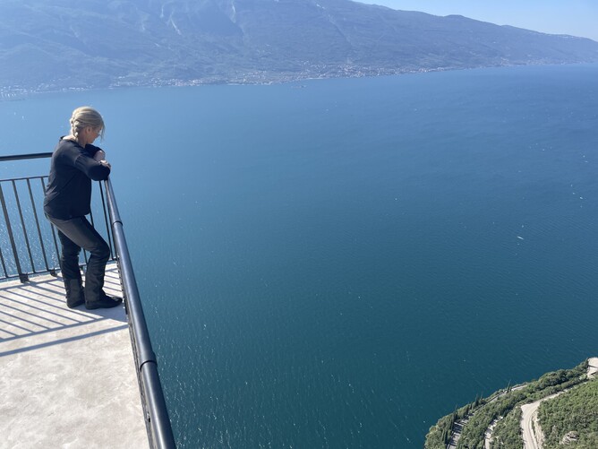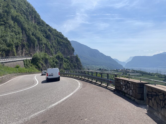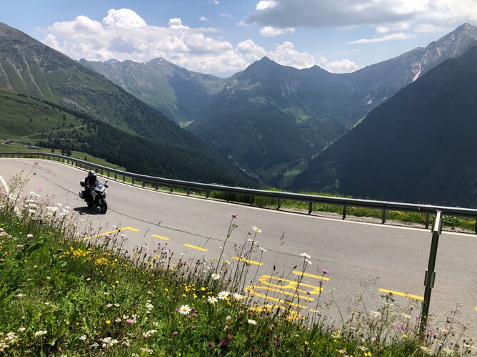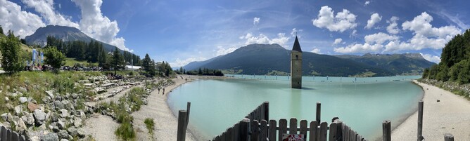 We rode through Italy, Austria, and Switzerland. Although the Behemoth shed some weight, it still felt like a tank. Just after Albula Pass, we stopped for coffee at a charming spot with some delicious treats. Next, we visited a man-made lake created by a dam, which submerged a village. The only trace of it was the steeple of the town's church poking out of the water. The roads were superb, but the tunnels—one was 3.7 km long!—were mind-blowing. The weather is finally playing ball!