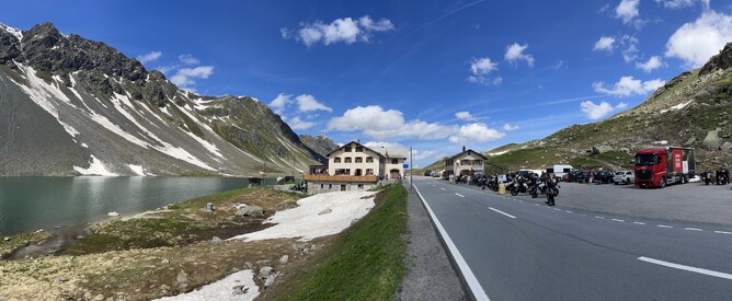 Well, today was a tough one. We tackled seven passes: Oberalp Pass, Lukmanier Pass, San Bernardino Pass, Splügen Pass, Maloja Pass, Bernina Pass, and Forcola di Livigno. Some were fast and flowing, while others were tight, twisty, and steep—almost to stalling speed. Very challenging when two-up and fully loaded with gear on a behemoth of a bike!