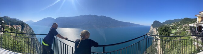 The last day of the Alps tour started with a chocolate breakfast and coffee. Francesco said we had enough time to head up to Hotel Paradiso for coffee. Halfway up, he took us into a 180-degree tight, tight, tight turn with a very steep incline, which you didn’t see coming as there was a building right at the apex of the corner. Riding the clutch, almost stalled, but made it! What did we get for it? Good coffee and stunning views of the lake.
