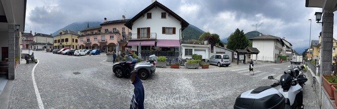 Another good day with the weather. Suspension re-checked. Tyre pressure checked. Off we go! Went over the Passo del Foscagno in Bornio for a water. Had a look at a huge wooden cuckoo clock but didn’t have the patience to wait for it to chime!