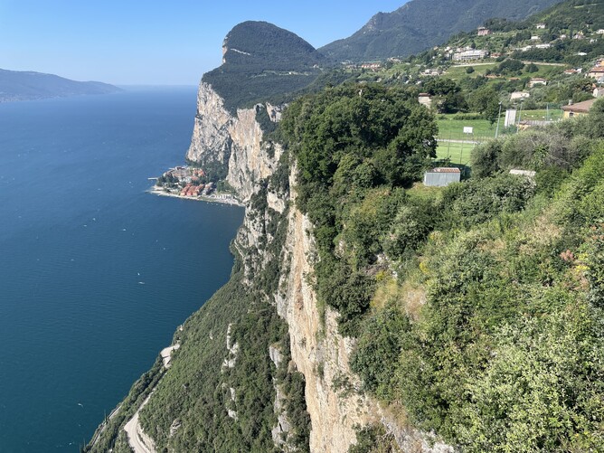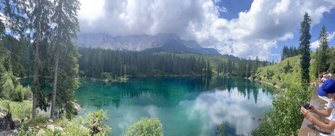 Stopped off at the top of Falzarego Pass for a coffee and a T-shirt. The cuckoo clocks were awesome. Had lunch at Lago di Carezza, where Francesco told us the legend of the lake. We ended up at Riva del Garda for the evening. Heading back south, though, means higher temperatures—32°C when we arrived.