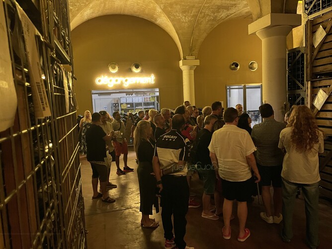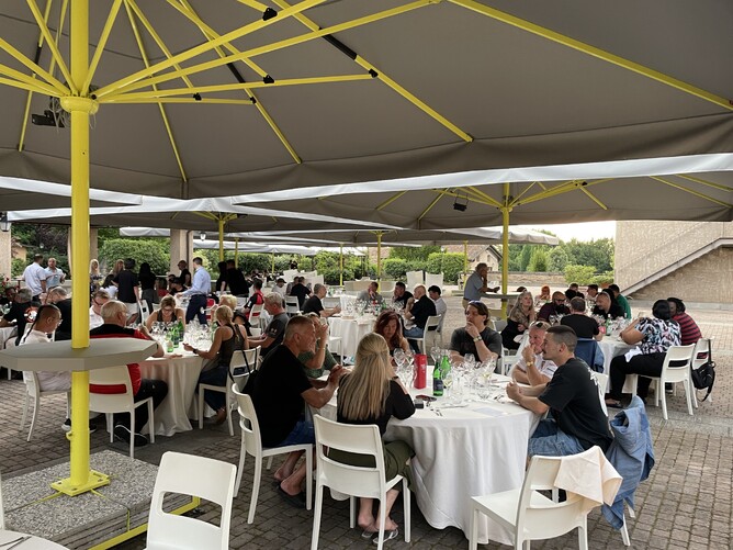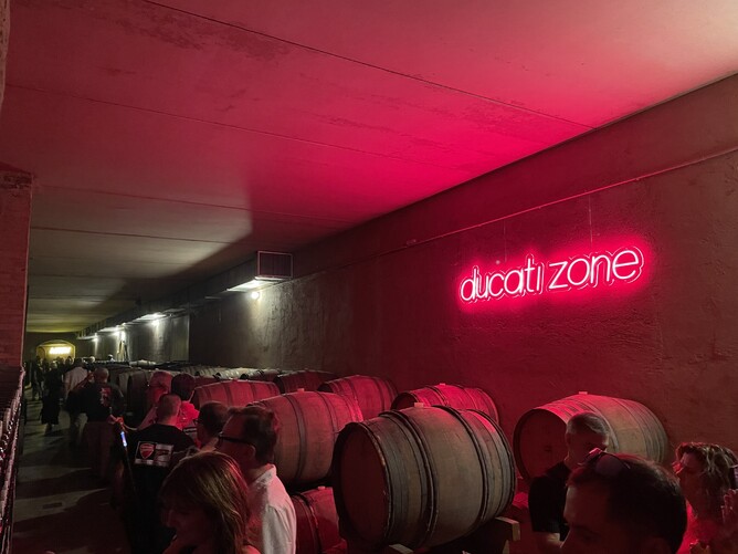 Afterward, we scooted down the left side of Lake Idro and returned to the hotel for a quick scrub-up before dinner. This time, the buses took us to Contadi Castaldi Winery, a Ducati sponsor that produces a wine under the Ducati name. We had a tour explaining the intricate process of winemaking. Phew! Wine production is so technical these days!