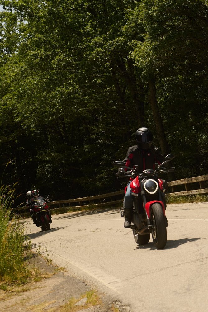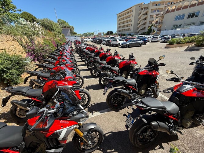 The next morning, the hotel carpark transformed into a Ducati showroom. 80 brand-new bikes gleaming under the Sicilian sun. I was in the Red Group, the “newbies,” and we bonded instantly over our shared awe. My ride? A nimble Ducati Monster, perfect for the tight switchbacks and sweeping coastal roads ahead.