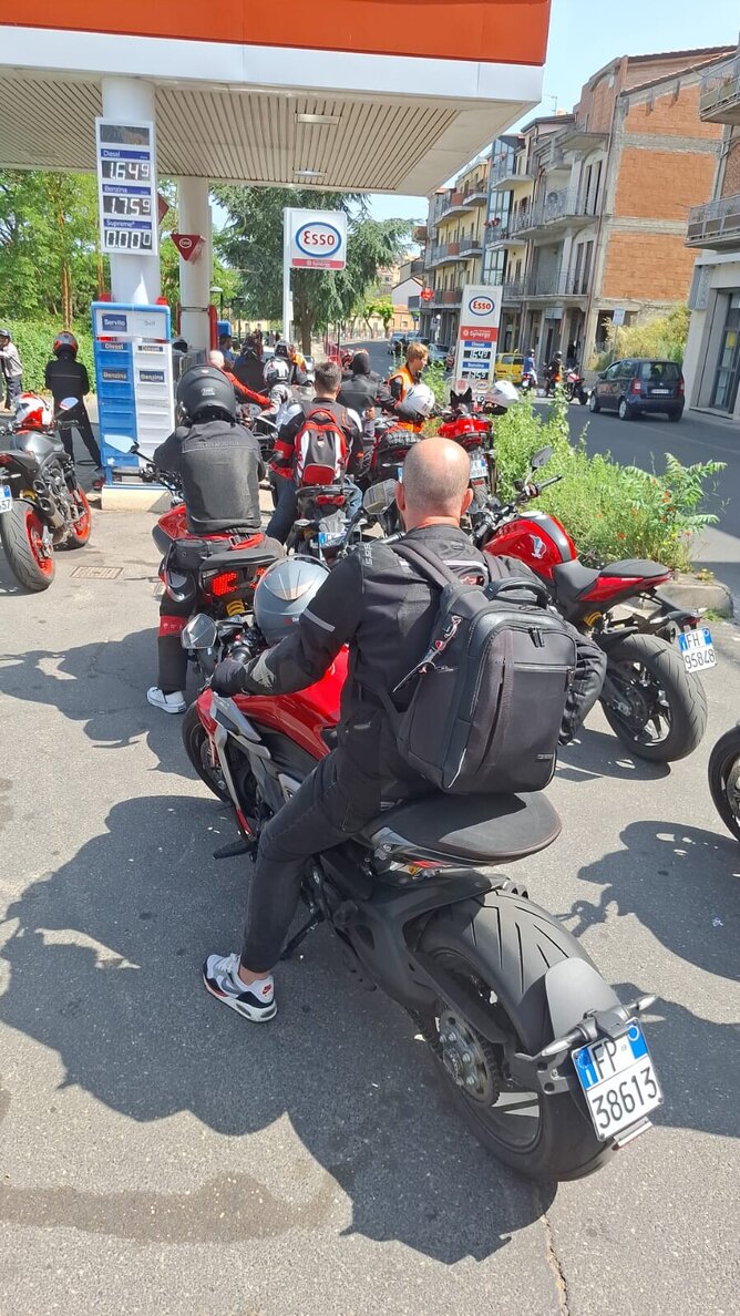 Each day followed a delicious rhythm: a morning ride through stunning Sicilian landscapes, a mid-morning espresso break, and an epic lunch, usually featuring pasta, swordfish, and the ever-present eggplant. After an afternoon ride under the blazing sun (with temperatures often soaring past 30°C), we’d roll back into our hotel. Thankfully, my Ducati summer jacket kept me cool and comfortable throughout the heat. A quick shower, an obligatory Facebook update to the DOCNZ page, and a video call with Stu, who, due to unfortunate circumstances, couldn’t make the trip with me, became part of my evening ritual. Then it was out the door again for a multi-course dinner that stretched late into the night.